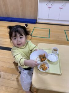 給食は、子どもたちに人気の【おにさんカレー】でした。